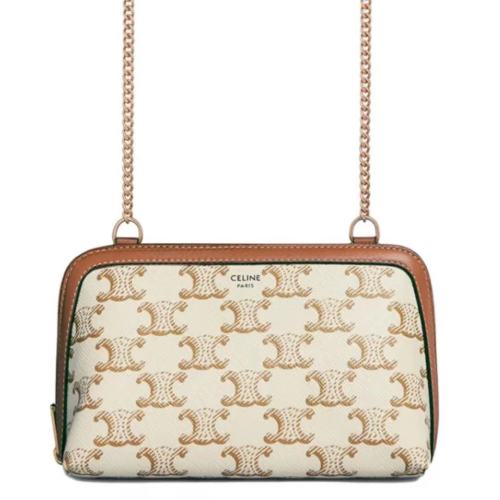 CELINE/赛琳 新款女士白色凯旋印花涂层帆布黄褐色小羊皮饰边链条单肩斜挎手拿包 10E382CBX01TA