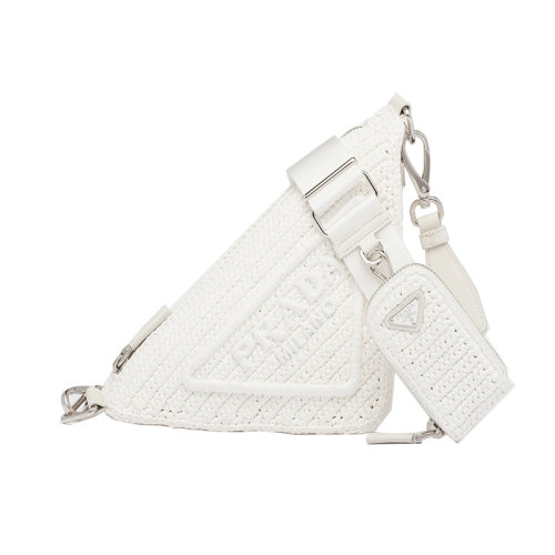 PRADA/普拉达 22新款 女士拉菲草编织白色三角型珐琅金属带徽标印花的配拆卸调节织物肩带斜挎包1BH190_2A2T_F0009_V_DRO