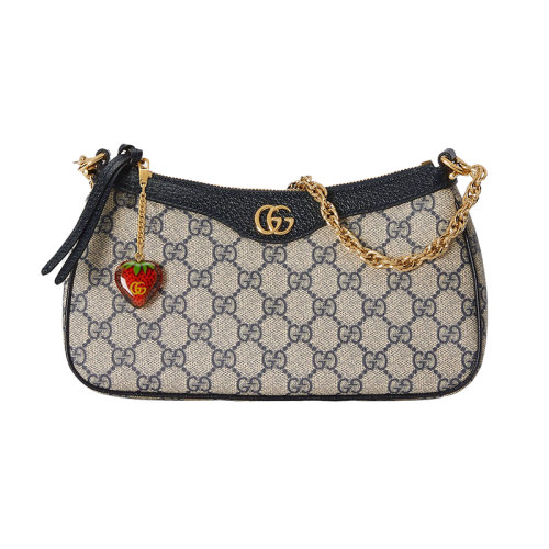 GUCCI/古驰 22新款 Ophidia系列 女士小号米色/蓝色帆布蓝色皮革饰面双g草莓拆卸吊饰拉链开合单肩手提包735132FABLE8881