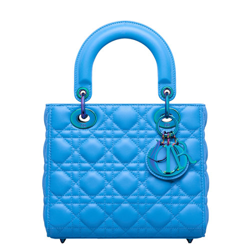 Dior/迪奥 22春夏新款LADY DIOR系列 女士小号亮蓝色羊皮革藤格纹缉面线镭射吊饰双手柄单肩手拿包 M05314NEE_M05Z