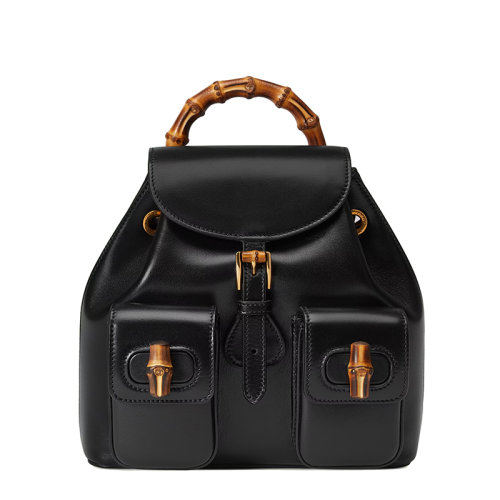 GUCCI/古驰 22新款 女士黑色皮革内置抽绳计翻盖搭扣竹节手柄双肩包背包702101UZY0T1000