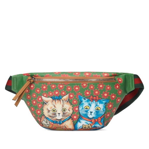 GUCCI/古驰 儿童款粉色绿色拼色帆布猫猫图案印花斜挎包腰包5095UR7AN3775