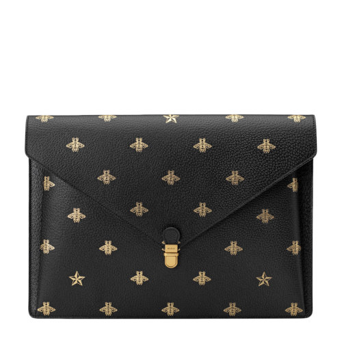 GUCCI/古驰 男士黑色皮革蜜蜂和星星图案印花翻盖开合手拿包公文包男包 500976-DJ2LT-1055