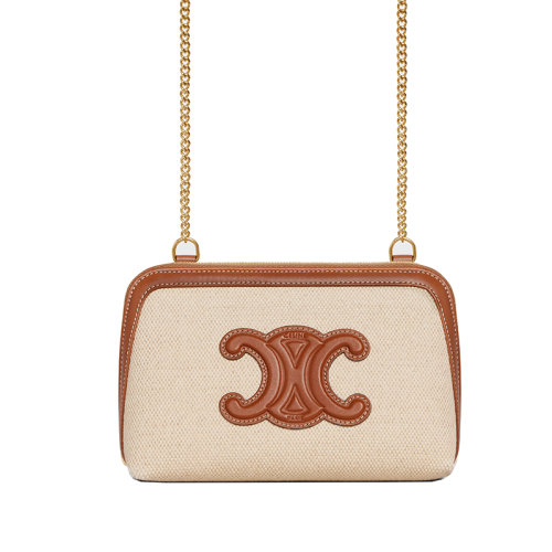 CELINE/赛琳 23春夏新款 女士自然色/棕褐色织物配皮拉链开合金色链条肩带单肩斜挎手拿包10E382DTL.02NT