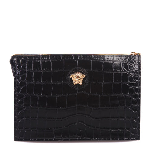 VERSACE/范思哲 男士黑色鳄鱼纹牛皮美杜莎头像装饰拉链开合钱包卡包手包腕包手拿包男包 DP87631-DCOV5-D41OH