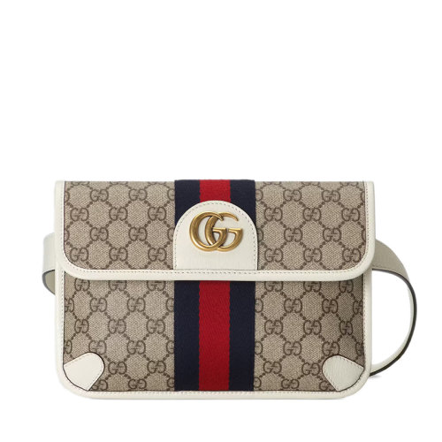 GUCCI/古驰 22春夏新款Ophidia系列 男士米色/乌木色老花帆布白色皮革滚边红蓝织带装饰金扣腰包67408196IWT9794