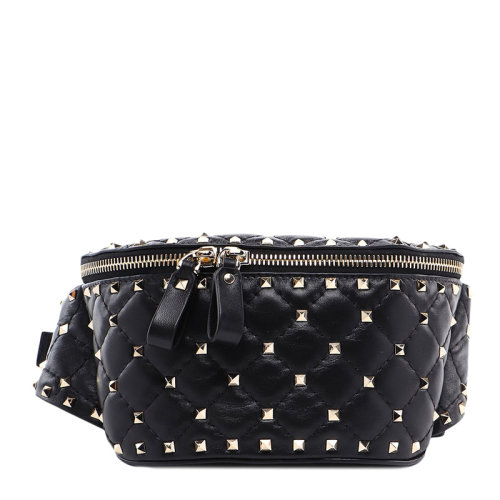 Valentino/华伦天奴 女士黑色羔羊皮经典铆钉装饰拉链开合单肩包斜挎包胸包腰包女包 SW2B0B46-NAP-0NO