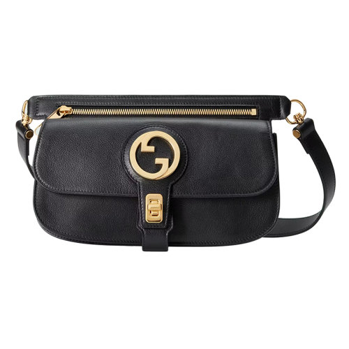 Gucci 古驰 22新款 男士黑色皮革配金色圆形GG搭扣开合斜挎腰包718154UXX0G1000