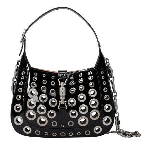 GUCCI/古驰 22新款 Jackie 1961系列 女士黑色漆皮金属镂空银色饰面单肩手提包?7037441J7CN8180