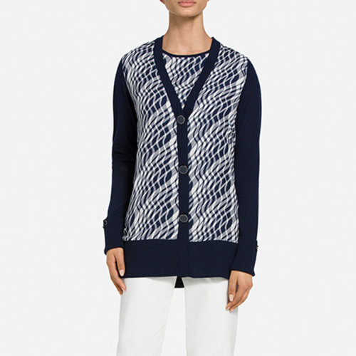 St.John/盛蔷深蓝色格纹羊毛针织开衫外套女士夹克K6100S2