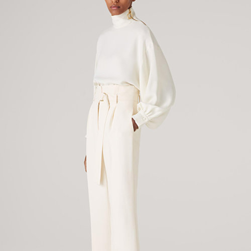 St.John/盛蔷白色真丝乔其纱宫廷袖高领女士长袖衬衫上衣K521W61