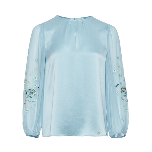 HUI/卉 女士长袖衬衫20秋季新品水绿色圆领捏褶衬衫刺绣设计套头衫