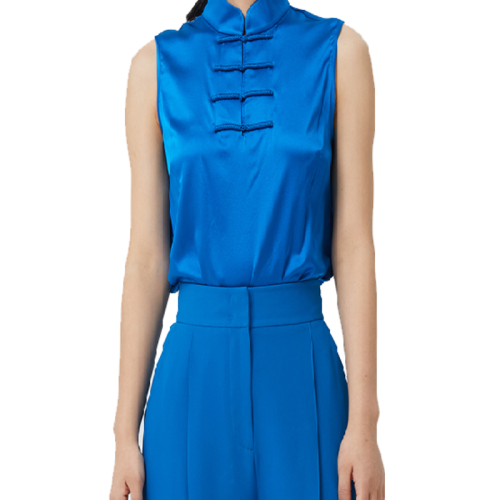 HUI/卉21年秋冬新品 靛蓝经典弹力重绉真丝小立领女士中式盘扣百搭国潮女士短袖衬衫上衣背心HR41B00851