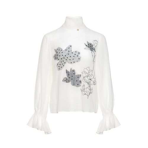 HUI/卉 女士长袖衬衫20年秋季新品茶白色真丝两件套上衣立体网纱绣花设计