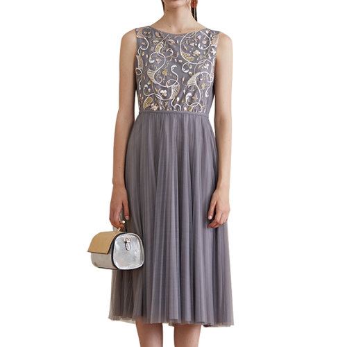 HUI/卉 女士连衣裙19夏季雾霾灰网纱刺绣连衣裙圆领无袖中长裙