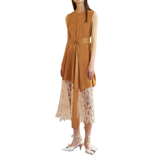 HUI/卉 女士连衣裙19春季黄棕色蕾丝拼接连衣裙圆领收腰中长款背心裙