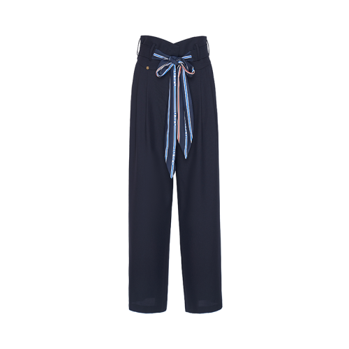 HUI/卉 女士休闲裤2020秋季新品藏蓝色阔腿裤高腰格纹腰带设计