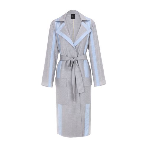 bifu by xingchen/彼伏 灰色格纹羊毛拼蓝条纹廓型女士风衣