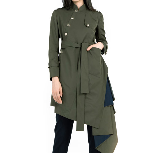 bifubyxingchen/彼伏军绿色旗袍领不对称女士风衣