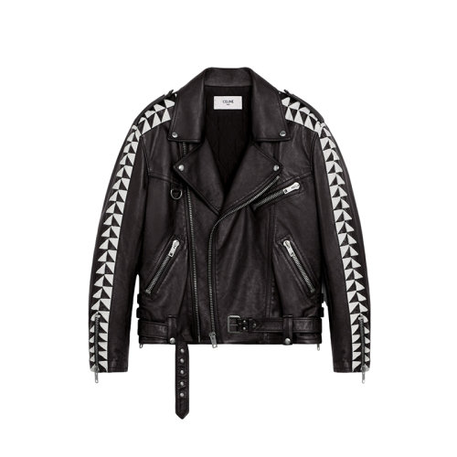 CELINE/赛琳 22年春夏新款 男士黑色/白色牛皮革三角形饰带超大机车夹克外套2EA91599E.09BW
