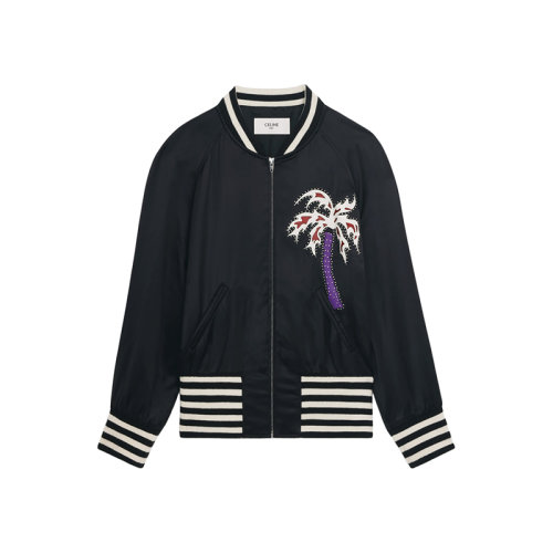 CELINE/赛琳 22年春夏新款 TYLER CHILDRESS联名系列 男士黑色粘胶纤维拼羊皮革饰PALM TREE刺绣缎面学院风夹克2V57H851C.38NO