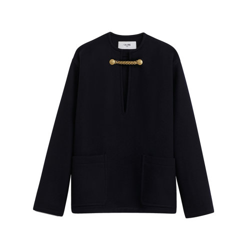 CELINE/赛琳 海军蓝 毛毡金色马车图案纽扣标识制服领短夹克2V24C814E.07MR