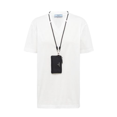 PRADA/普拉达 22年早春新款 女士白色平纹针织配有一个可拆小包棉质短袖V领T恤135699_1XBH_F0964_S_212