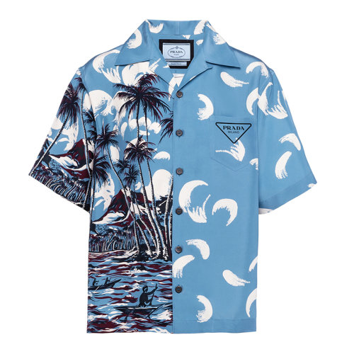 PRADA/普拉达 Double Match系列 男士浅紫光蓝色海滩和白云印花丝质短袖衬衫UCS406_1ZVK_F0237_S_212
