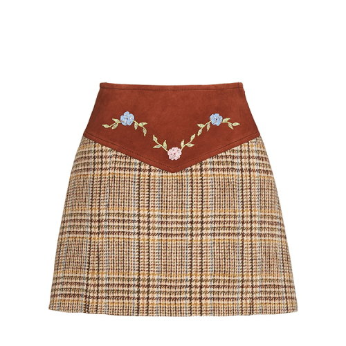 MiuMiu/缪缪 棕色 女士花朵刺绣装饰苏格兰格纹半身裙 MG1358_1V7S_F0D22