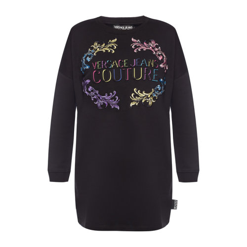 VERSACE JEANS/范思哲牛仔 女士黑色棉质混纺聚酯纤维彩色字母徽标印花装饰圆领长袖连衣裙卫衣裙 D2HUB465-30296-899