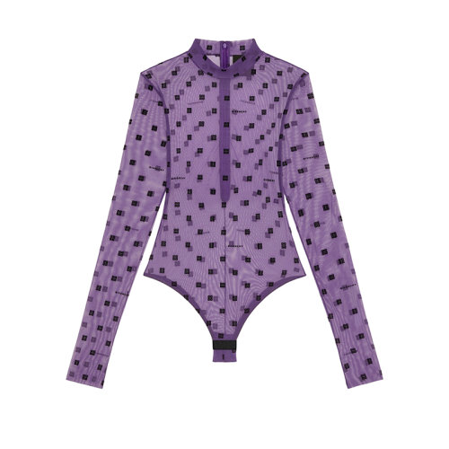 Givenchy/纪梵希 22年秋冬新款 女士茄紫色/海军蓝色锦纶混纺弹力薄纱天鹅绒LOGO图案长袖紧身衣BWB01G30ND-505