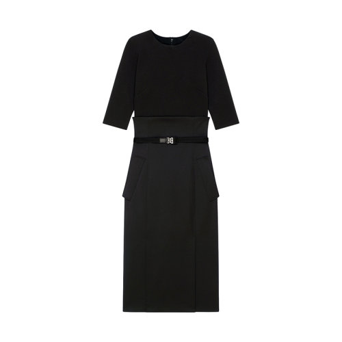 Givenchy/纪梵希 22年秋冬新款 女士黑色科技羊毛混纺斜纹短袖中长款连衣裙BW21GK14FX-001