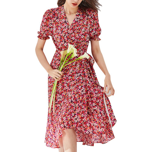 GeleiStory/GeleiStory 春夏新款荷叶边DV轻熟修身显瘦人丝碎花连衣裙裹身系带茶歇裙 女装>女士裙装>女士连衣裙