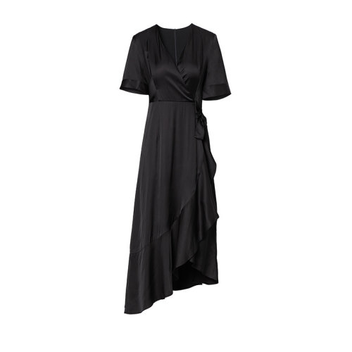 GeleiStory/GeleiStory 夏季新款女气质V领高腰系带纯色不规则荷叶摆醋酸中长连衣裙 女装>女士裙装>女士连衣裙