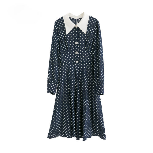 GeleiStory/GeleiStory 夏季新款白色尖领水钻扣蓝白波点修身真丝气质连衣裙女 女士裙装>女士连衣裙