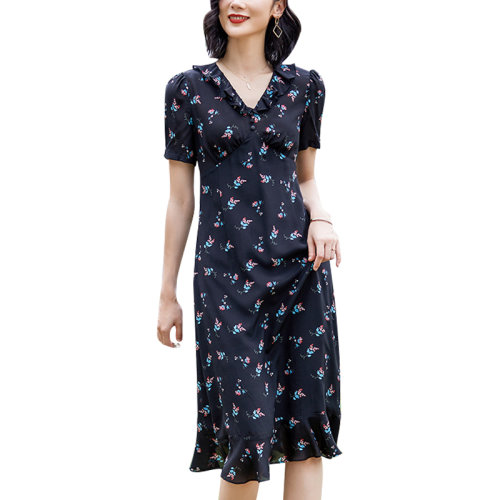 GeleiStory/GeleiStory 夏季新款气质v领中长款真丝连衣裙法式荷叶边 女装>女士裙装>女士连衣裙