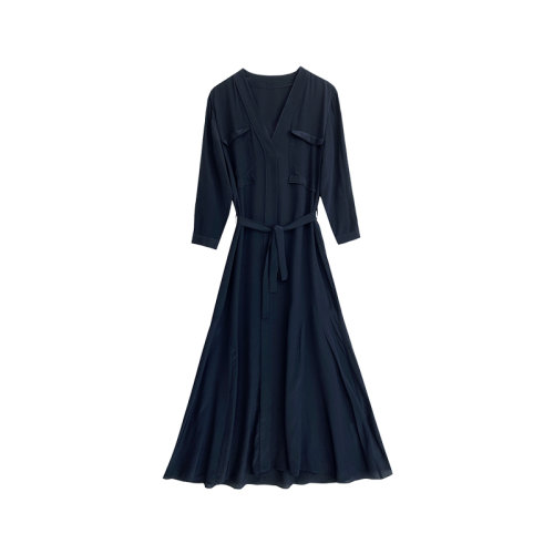 GeleiStory/GeleiStory 真丝纯色连衣裙夏季桑蚕丝七分袖V领气质衬衫裙女中长款 女装>女士裙装>女士连衣裙