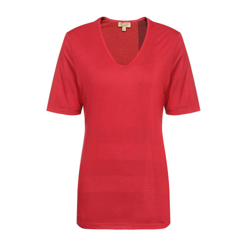 BURBERRY/博柏利 莫代尔纤维红色V领女士短袖T恤 短T 上装 格纹饰边 瑕疵特卖(陈列痕迹,不影响使用) 博柏利t恤