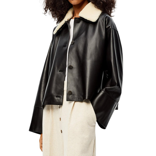 LOEWE/罗意威 女士黑色/象牙色纳帕皮革和剪羊毛领夹克S359Y19L12-1132