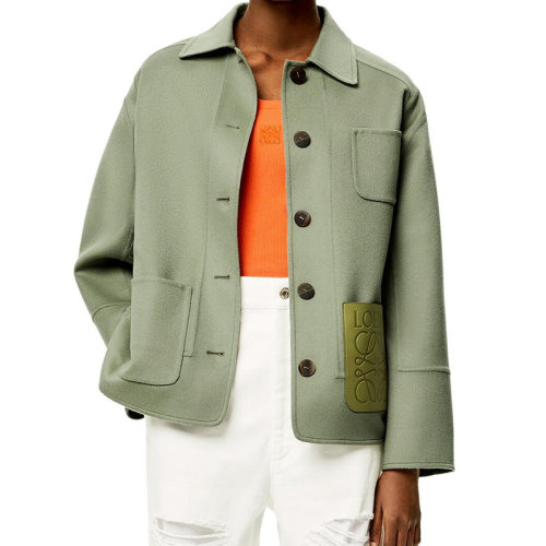 LOEWE/罗意威 22年秋冬新款 女士鼠尾草绿色双面羊毛羊绒面料饰有压花小牛皮LOGO口袋直筒夹克S359Y02X56-4380