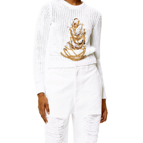 LOEWE/罗意威 22年秋冬新款 女士牛软白色系工刺绣金链罗纹麻和亚麻针织圆领毛衣S359Y14KAD-1950