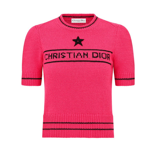 DIOR/迪奥 22年早春新款 女士亮粉色羊毛和羊绒混纺针织面料标志星星图案刺绣短袖针织衫毛衣224S09AM308_X4800