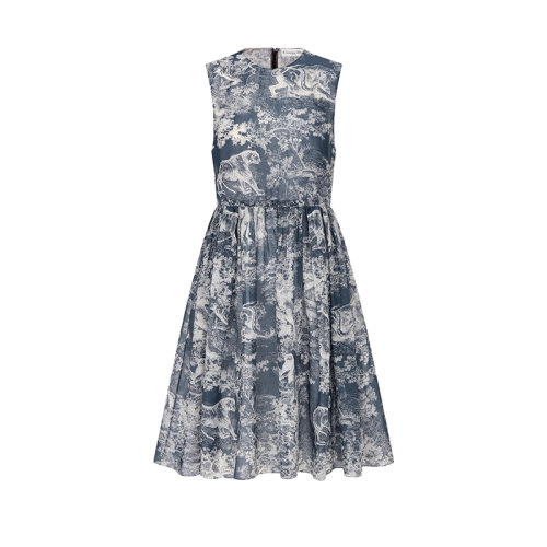 DIOR/迪奥 22年春夏新款 女士海军蓝色纯棉薄纱Reverse茹伊印花无袖中长款连衣裙221R84A3846_X5813