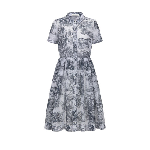 DIOR/迪奥 22年早春新款 女士白色/海军蓝色纯棉薄纱茹伊印花中长款衬衫式连衣裙221R81A3802_X0861