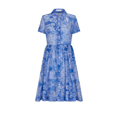 DIOR/迪奥 22年秋冬新款 女士湖蓝色纯棉薄纱面料Reverse茹伊印花图案中长款衬衫式连衣裙241R81A3846_X5882