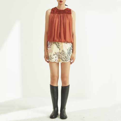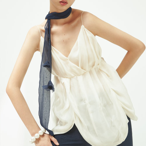 nisiss/怡夕柯根纱花形衣角微褶吊带女士短袖T恤n153av37