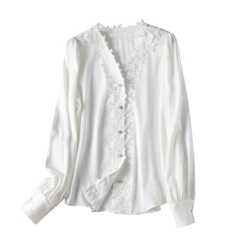 GeleiStory/GeleiStory 春夏新款轻奢美立体花朵珠片刺绣V领长袖真丝衬衫女蚕丝上衣女装女士衬衫>女士长袖衬衫