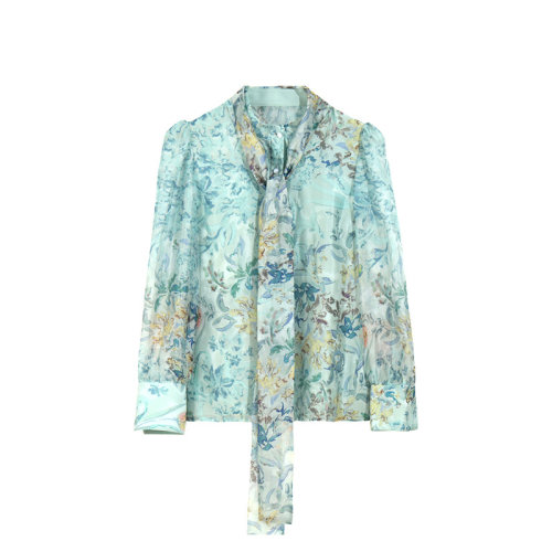 GeleiStory/GeleiStory GELEISTORY 2022秋季新款印花立领质感亲肤柔顺薄透飘带气质水墨灯笼袖衬衫