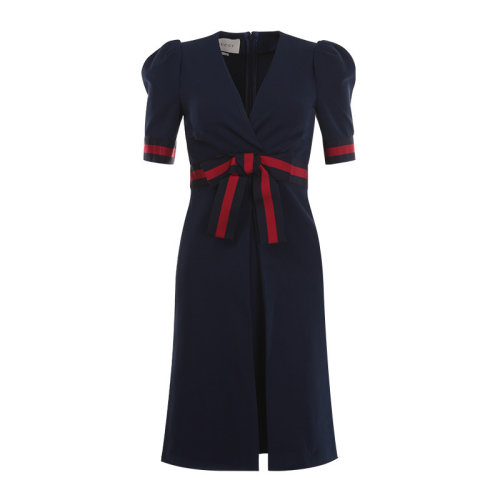 GUCCI/古驰 深蓝色 V领 腰部条纹蝴蝶结 短袖 女士连衣裙 501488 X7B04 4969