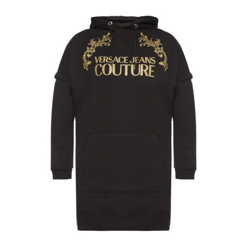VERSACE JEANS/范思哲牛仔 女士黑色棉质混纺涤纶经典字母徽标印花装饰长袖连帽连衣裙卫衣裙 B6HUB782-30282-899